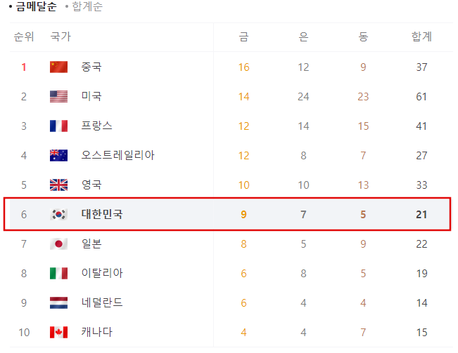 8월4일 10시 현재 6위로 금메달 9개 은메달 7개 동메달 5개 합계 21개의 메달을 손에 넣었답니다.
